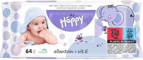 Pagamintos iš minkšto neaustinio audinio, Happy servetėlės su alantoinu ir vitaminu E yra skirtos visų tipų odai. Dėl kruopščiai atrinktų ingredientų ir neutralaus pH, jos švelniai valo ir prižiūri jūsų kūdikio odą. Alantoinas ir vitaminas E puikiai drėkina odą ir sukuria apsauginį sluoksnį, kuris apsaugo nuo išsausėjimo. Servetėlių sudėtyje nėra etilo alkoholio, silikonų ar parabenų. Sukurtos jūsų kūdikio odos priežiūrai.