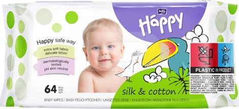 Pagamintos iš minkšto neaustinio audinio, Happy Silk & Cotton servetėlės yra skirtos visų tipų odai. Dėl kruopščiai atrinktų ingredientų, natūralių šilko baltymų ir medvilnės ekstrakto bei neutralaus pH, jos švelniai valo ir prižiūri jūsų kūdikio odą. Servetėlių sudėtyje nėra etilo alkoholio, silikonų ar parabenų. Sukurtos jūsų kūdikio odos priežiūrai.