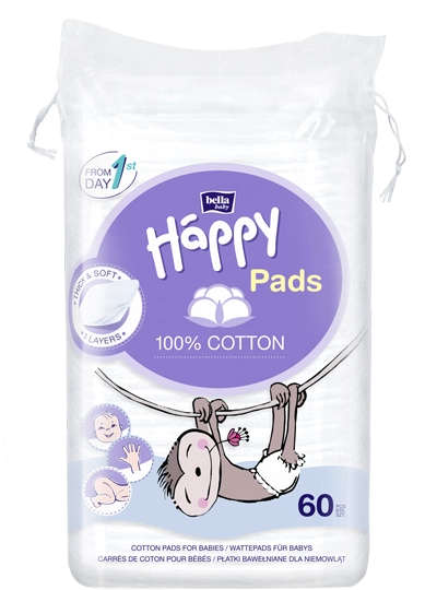 3 sluoksnių medvilniniai higieniniai diskeliai Happy yra skirti kūdikio veido, rankų ir sėdmenų srities priežiūrai.
